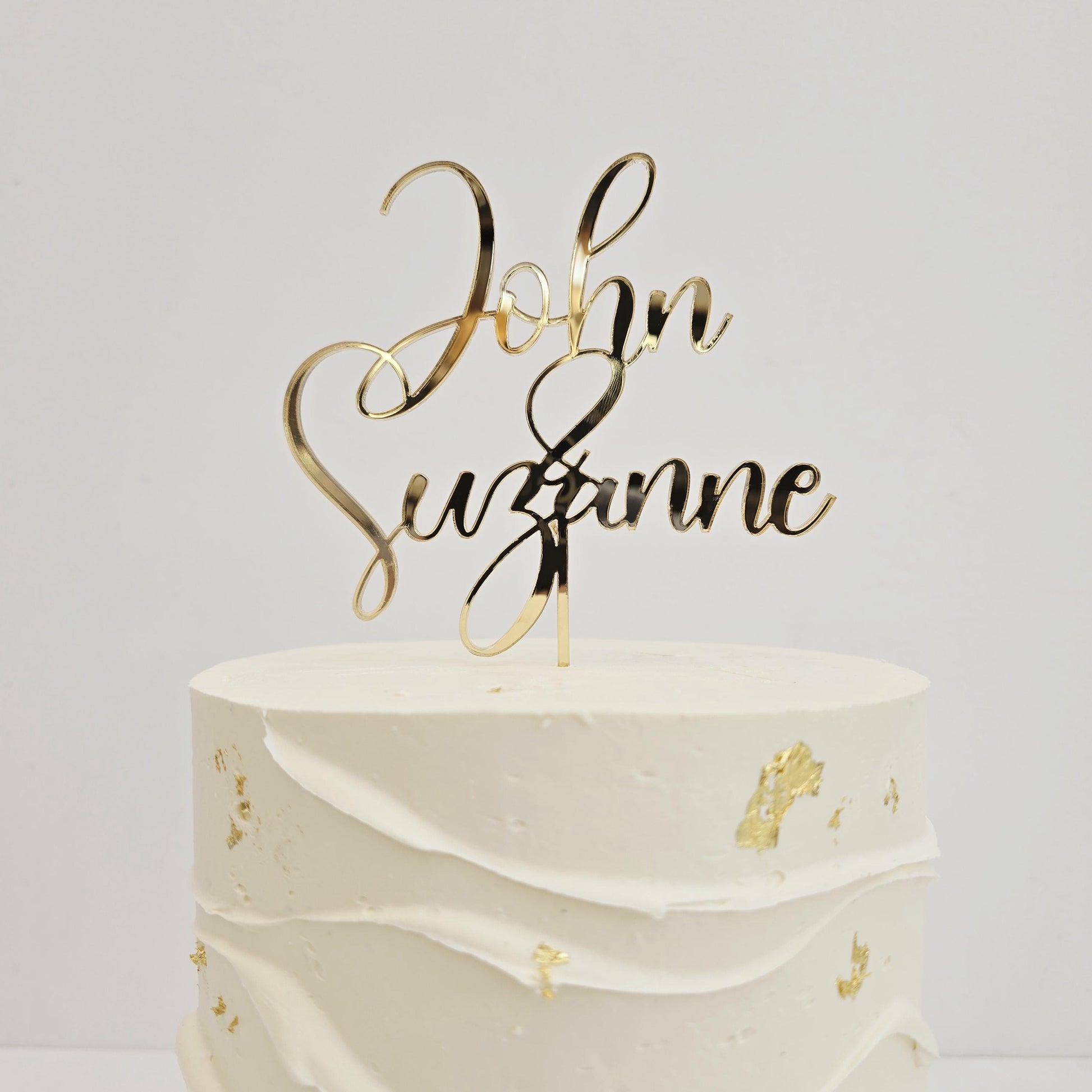 This beautiful script font, features the couples first names and joined with an ampersand. Beautiful swirls and curls makes this cake topper the perfect addition to your engagement and/or wedding cake.