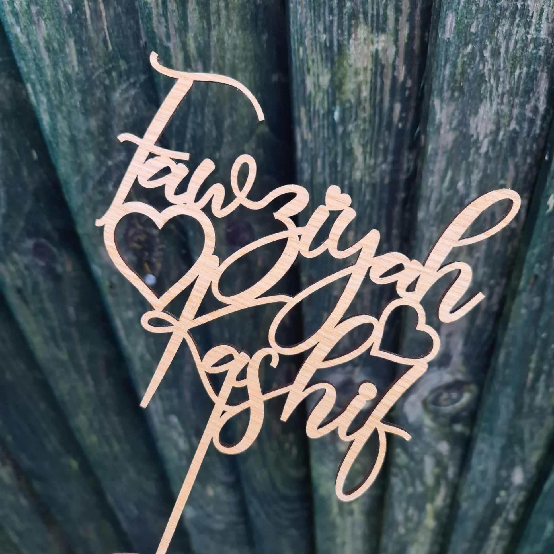 This beautiful script font, features the couples first names and joined with an ampersand. Beautiful swirls and curls makes this cake topper the perfect addition to your engagement and/or wedding cake.